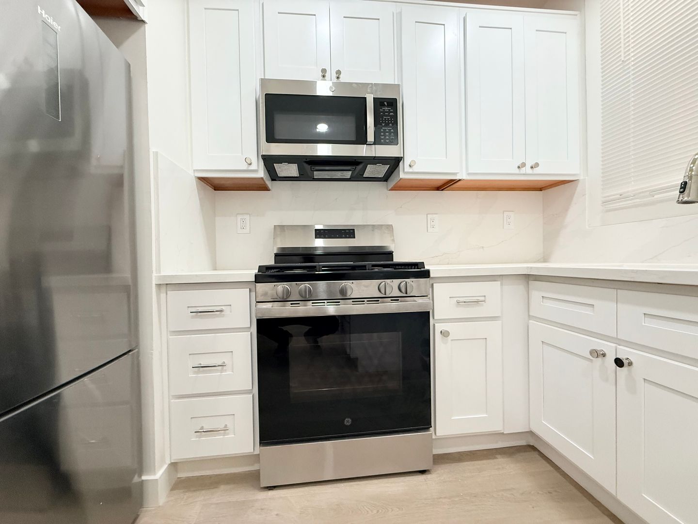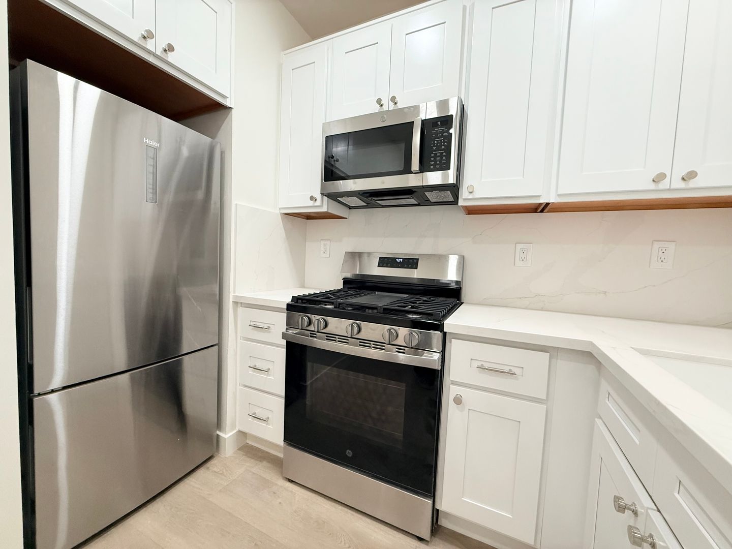-Updated kitchen with stainless steel appliances and quartz counters