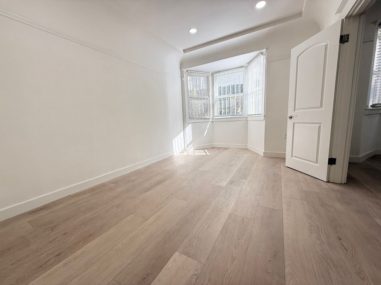 -Spacious living room and bedroom with white oak floors throughout