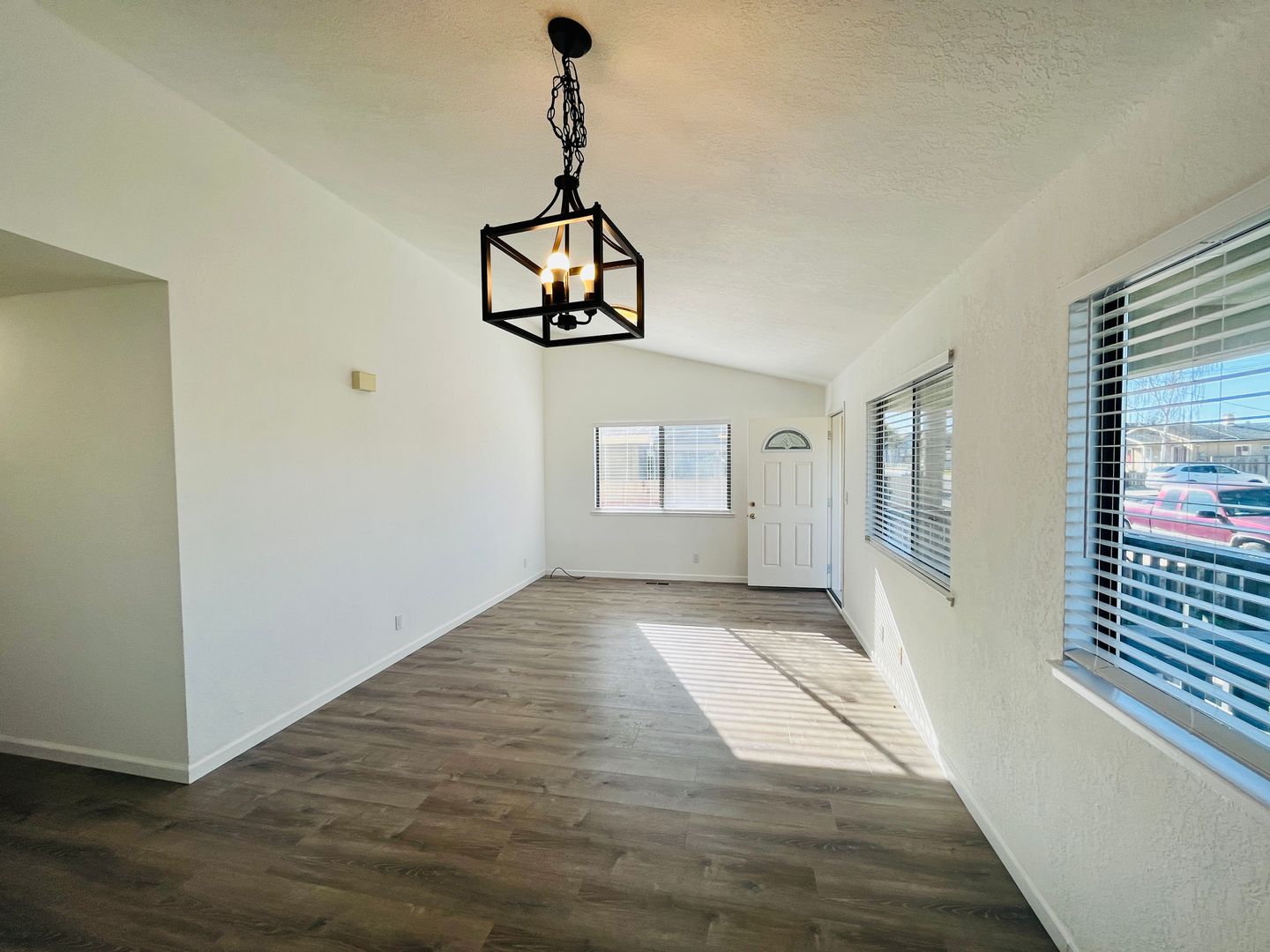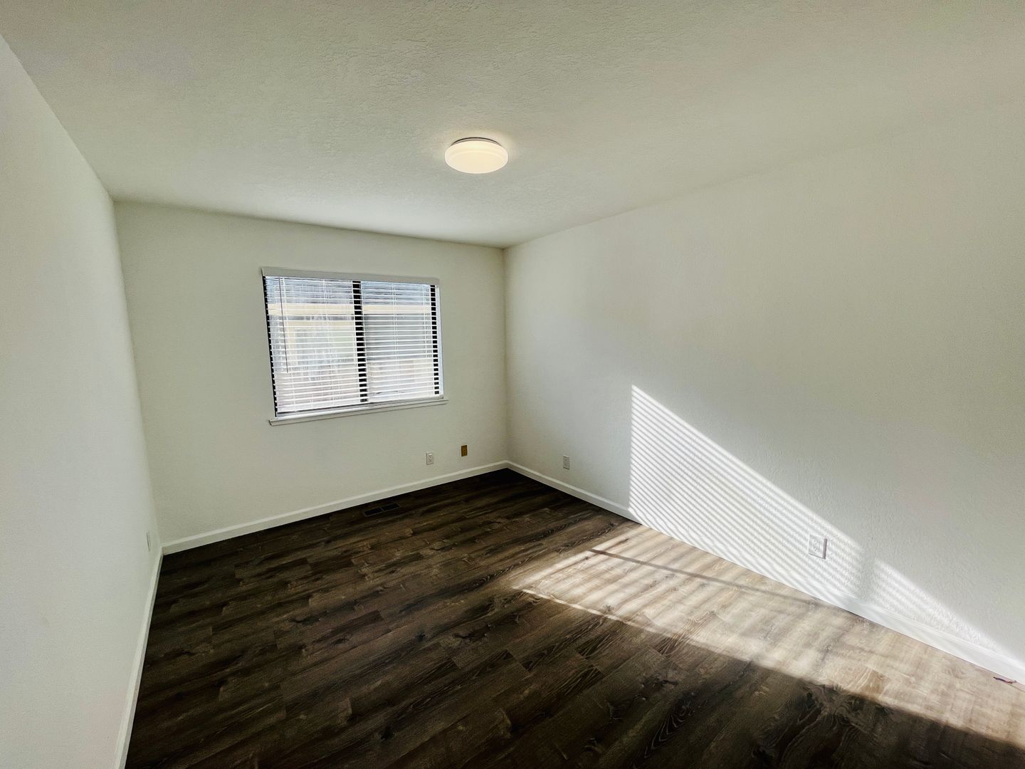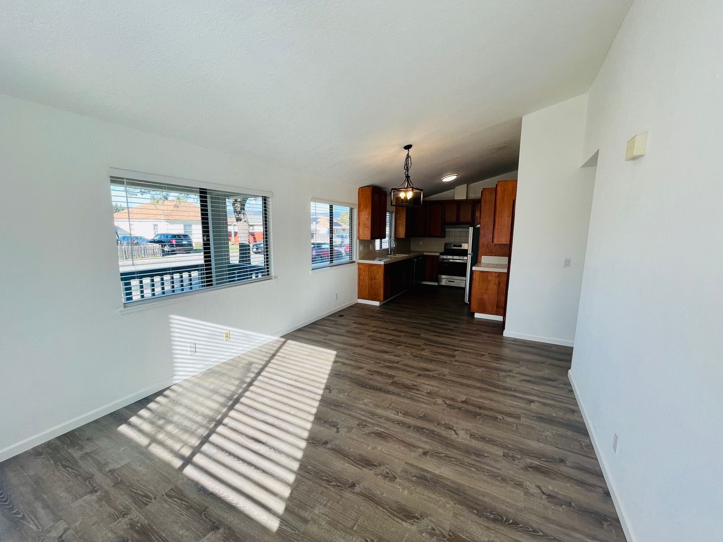This three-bedroom, one-bathroom house features updated flooring in all the bedrooms and living room. Fresh paint inside and out. The kitchen includes a gas range and a brand-new dishwasher. The house has a two-car garage as well as a front porch.