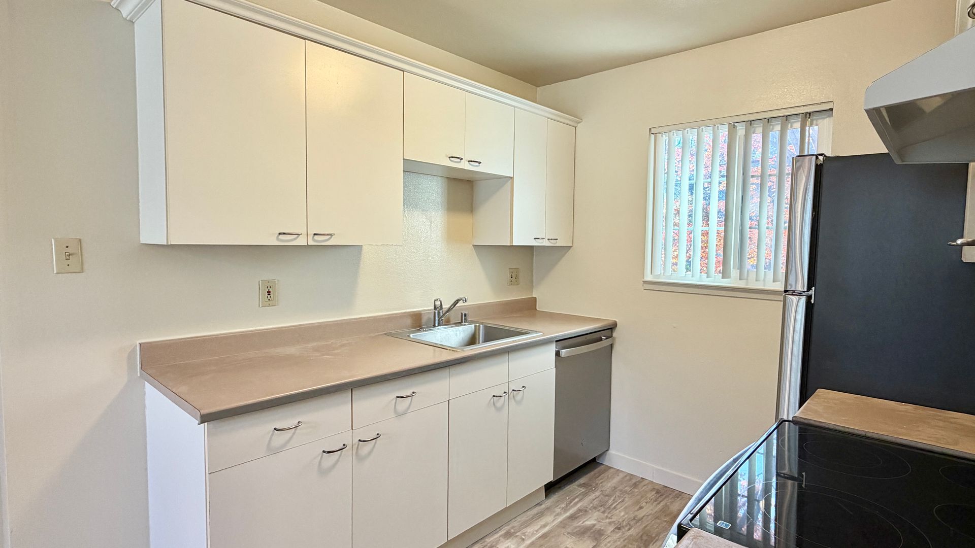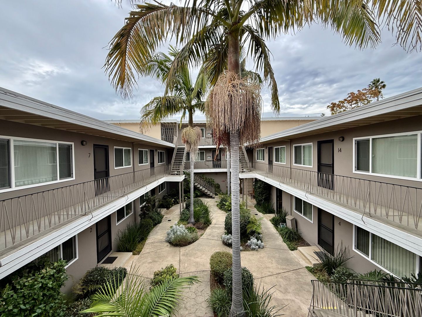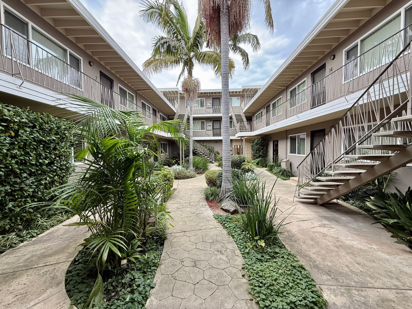 Newly remodeled 2 BR/1 BA unit in a peaceful complex with a garden courtyard. Bright and spacious (940 sq ft). Unit located on the second floor. Kitchen has dishwasher, garbage disposal, and great cabinet space, and stainless steel appliances. Bedrooms have ceiling fans and spacious, full-mirror closet doors. Spacious bathroom with two storage cabinets. Large linen closet next to the bathroom and a coat closet in the hallway. Double pane windows. Onsite laundry available.