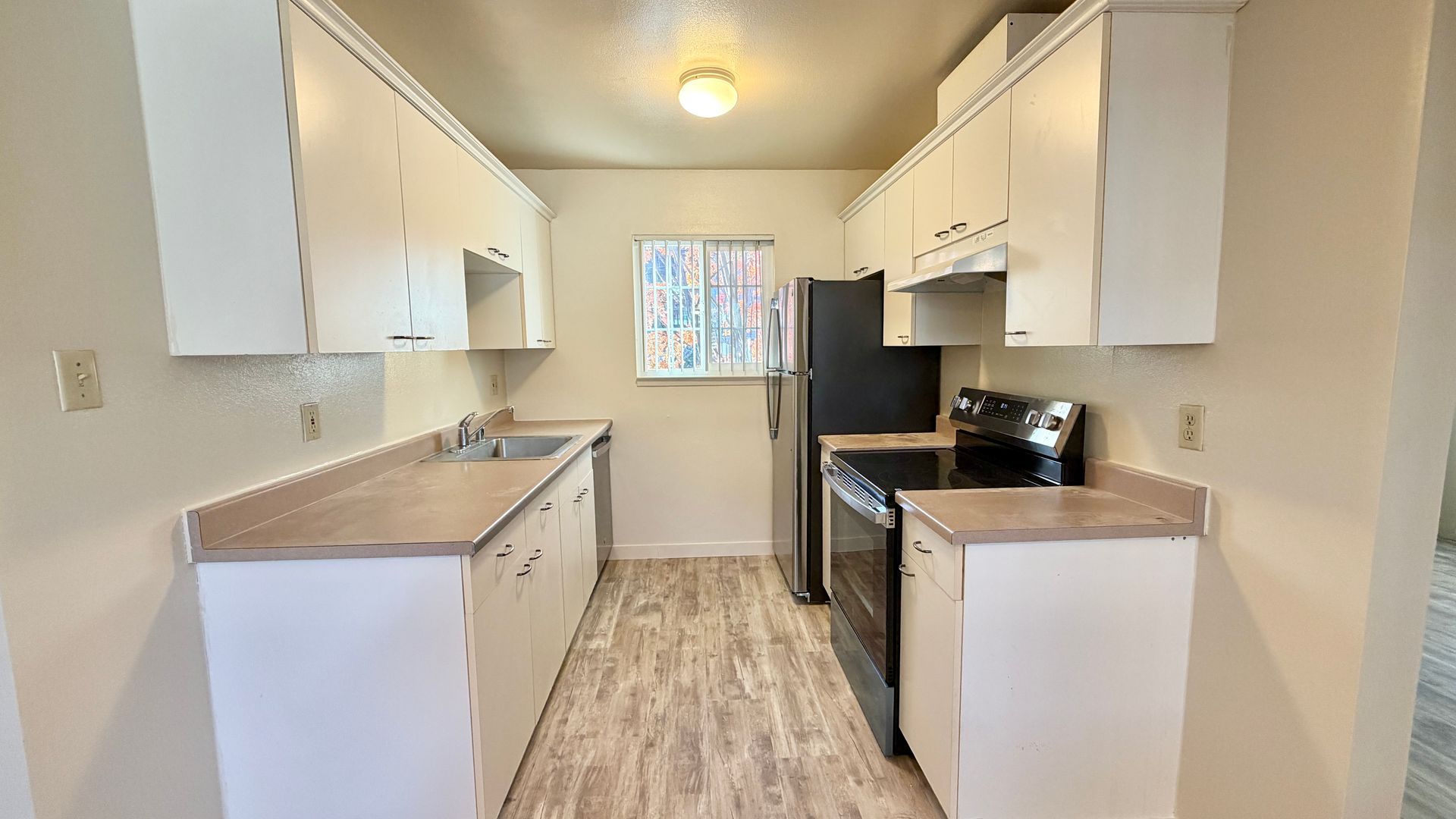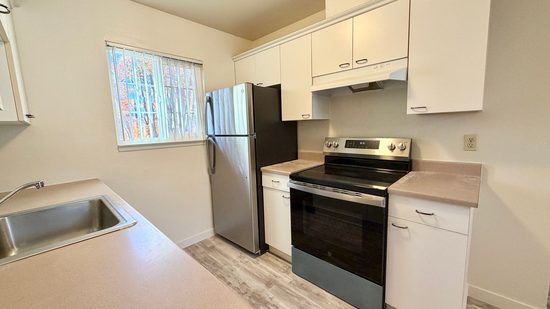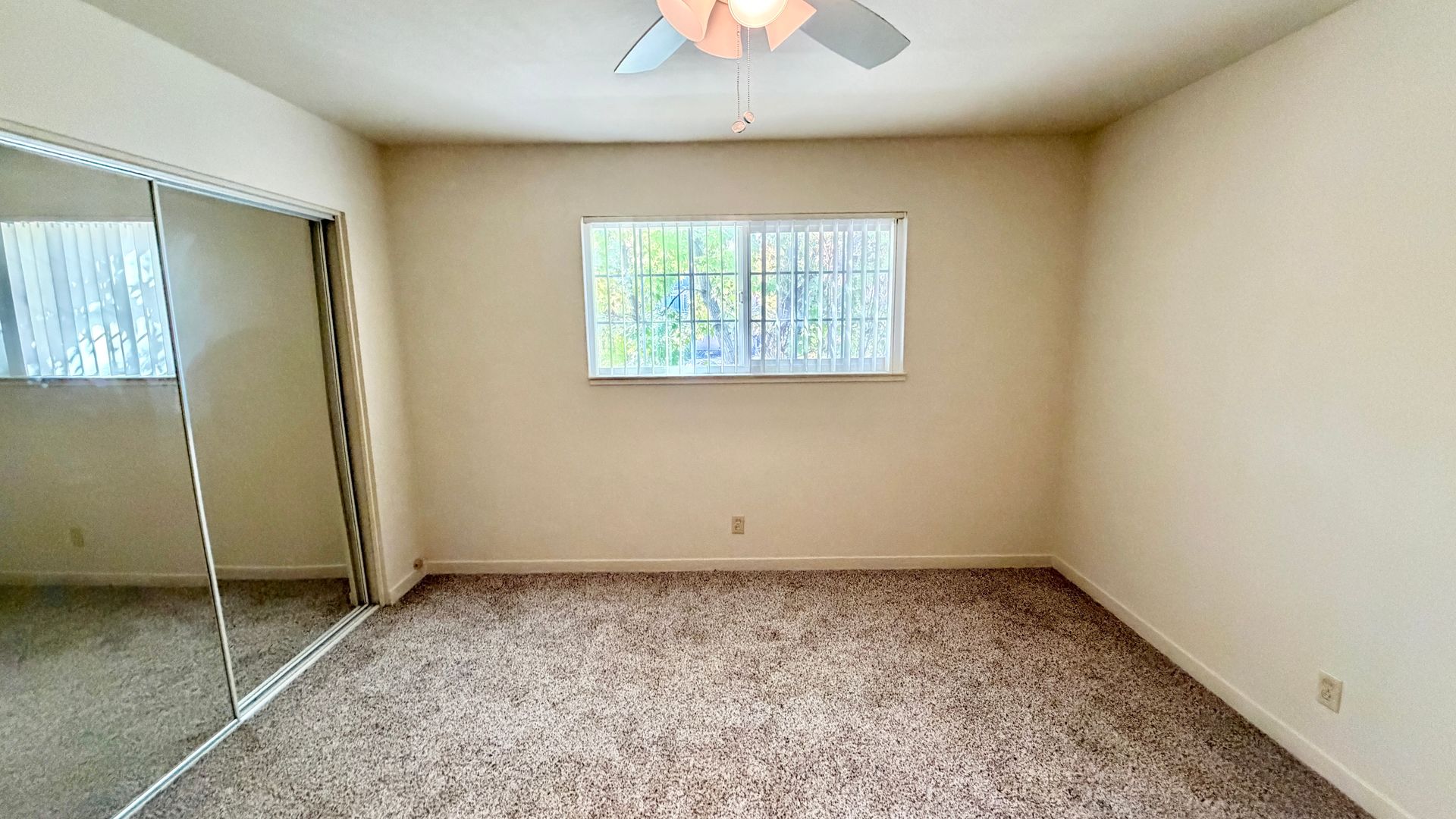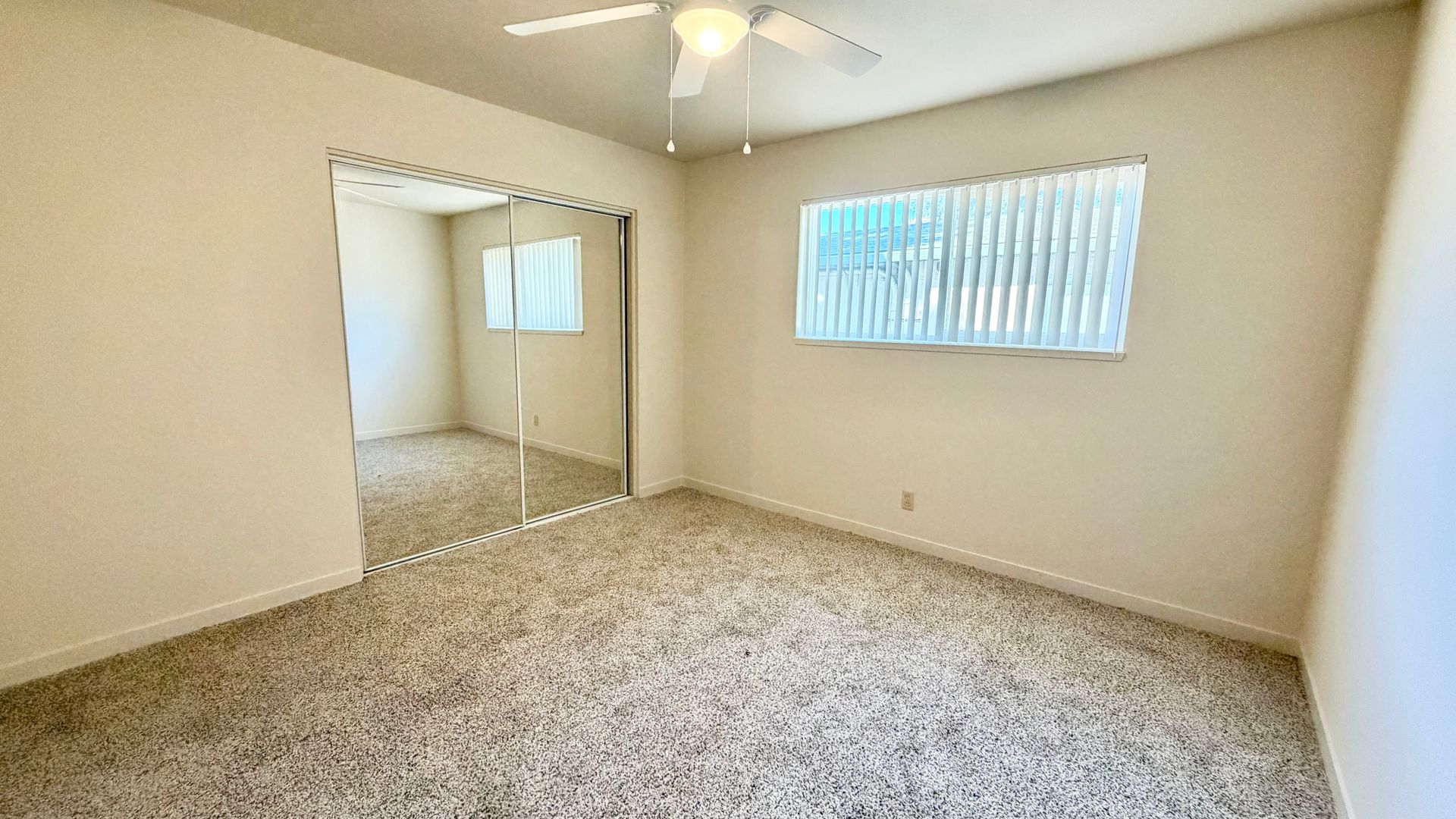 Newly remodeled 2 BR/1 BA unit in a peaceful complex with a garden courtyard. Bright and spacious (940 sq ft). Unit located on the second floor. Kitchen has dishwasher, garbage disposal, and great cabinet space, and stainless steel appliances. Bedrooms have ceiling fans and spacious, full-mirror closet doors. Spacious bathroom with two storage cabinets. Large linen closet next to the bathroom and a coat closet in the hallway. Double pane windows. Onsite laundry available.