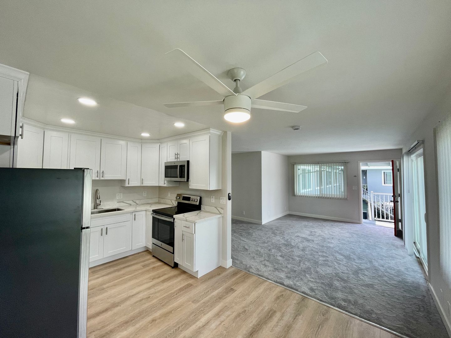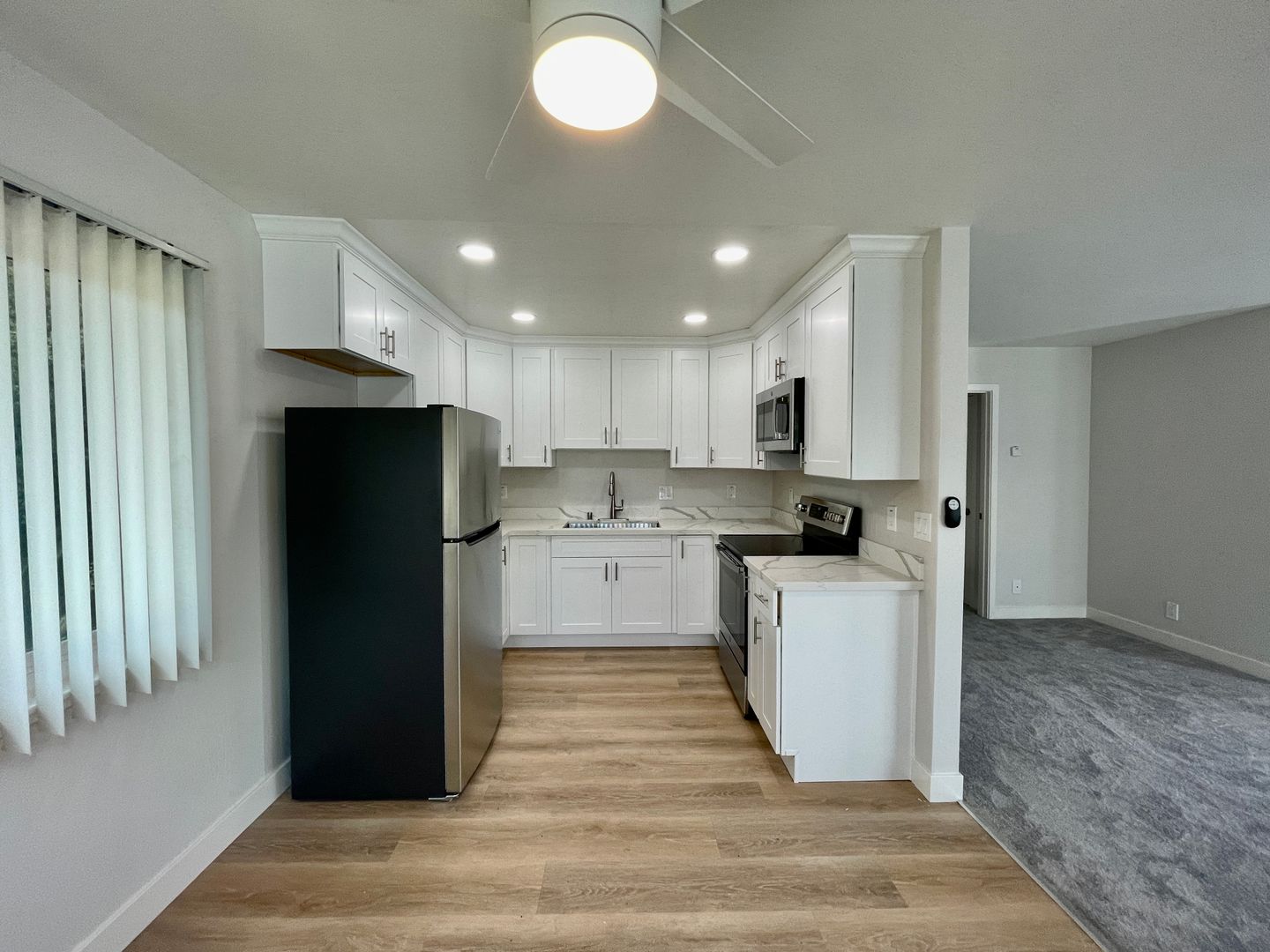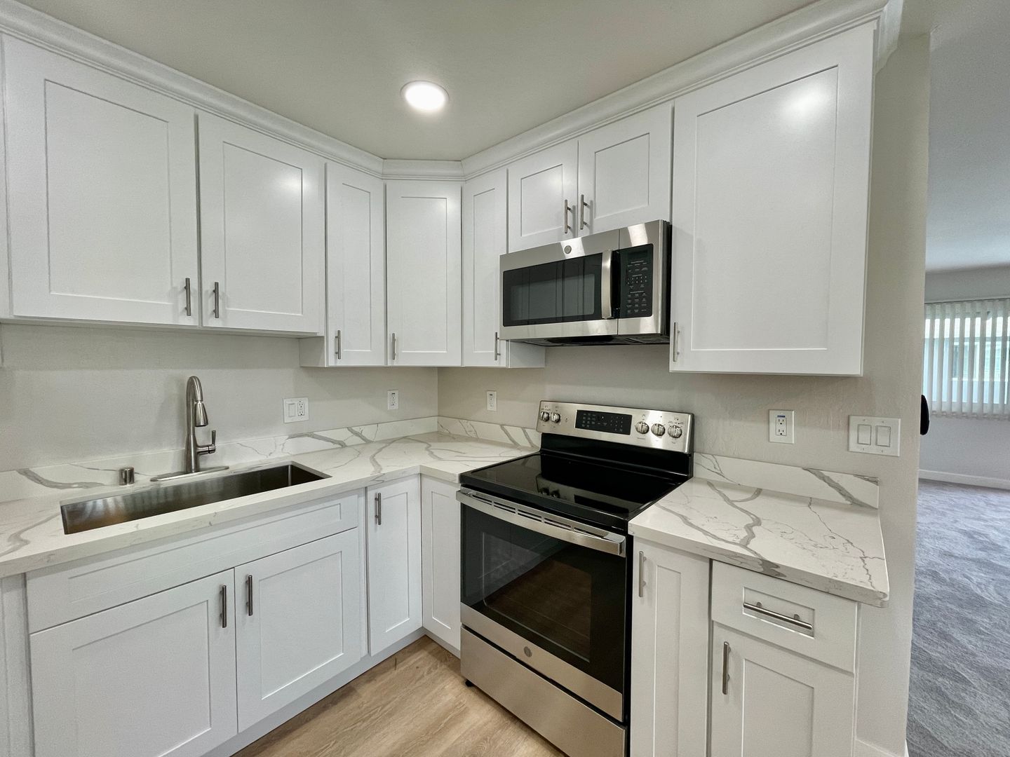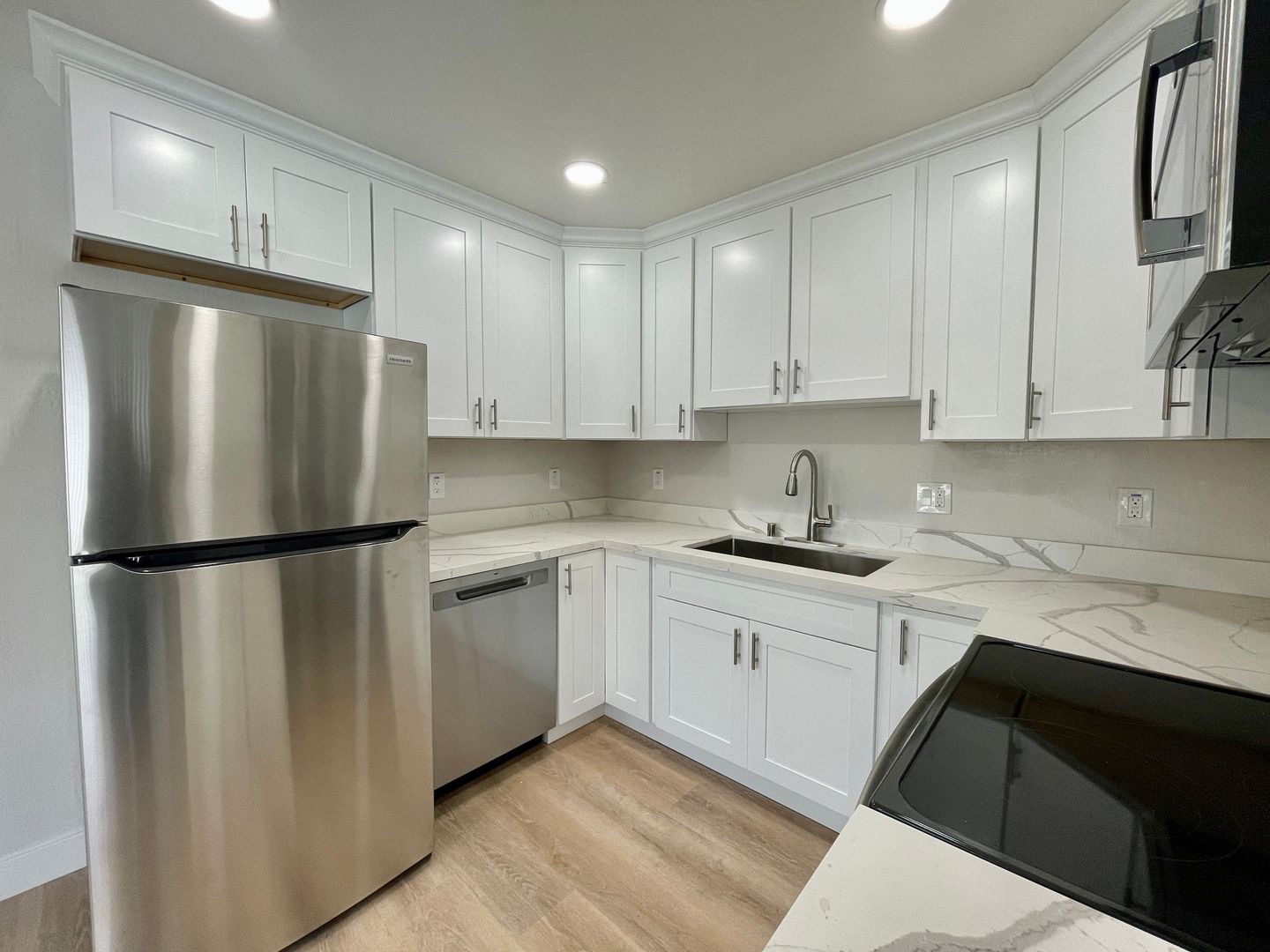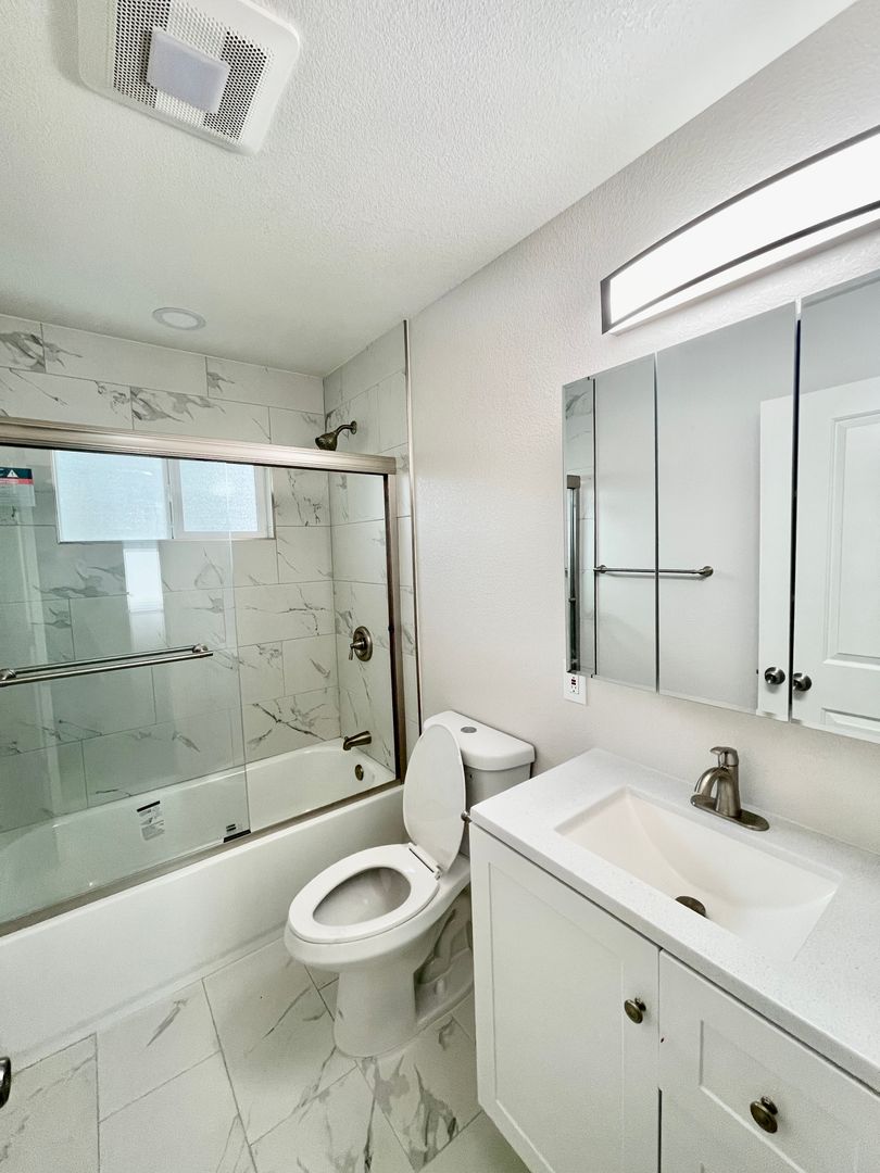 This beautiful upstairs 2 bedroom unit features a completely remodeled kitchen with stainless steel appliances, white shaker cabinets and quartz countertops. Completely remodeled bathroom with new tile floors, tile shower, vanity and fixtures. The community features a shared pool!